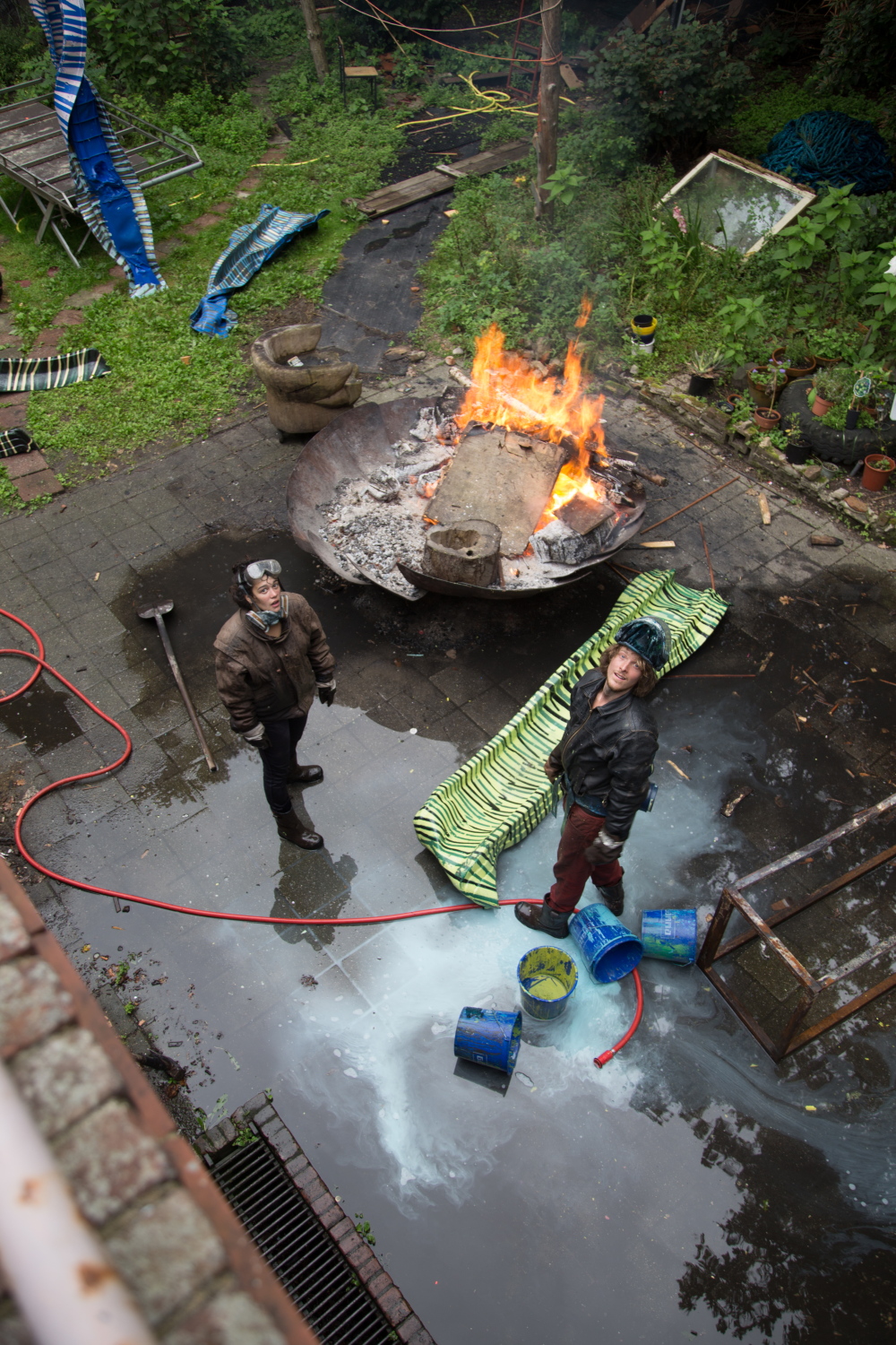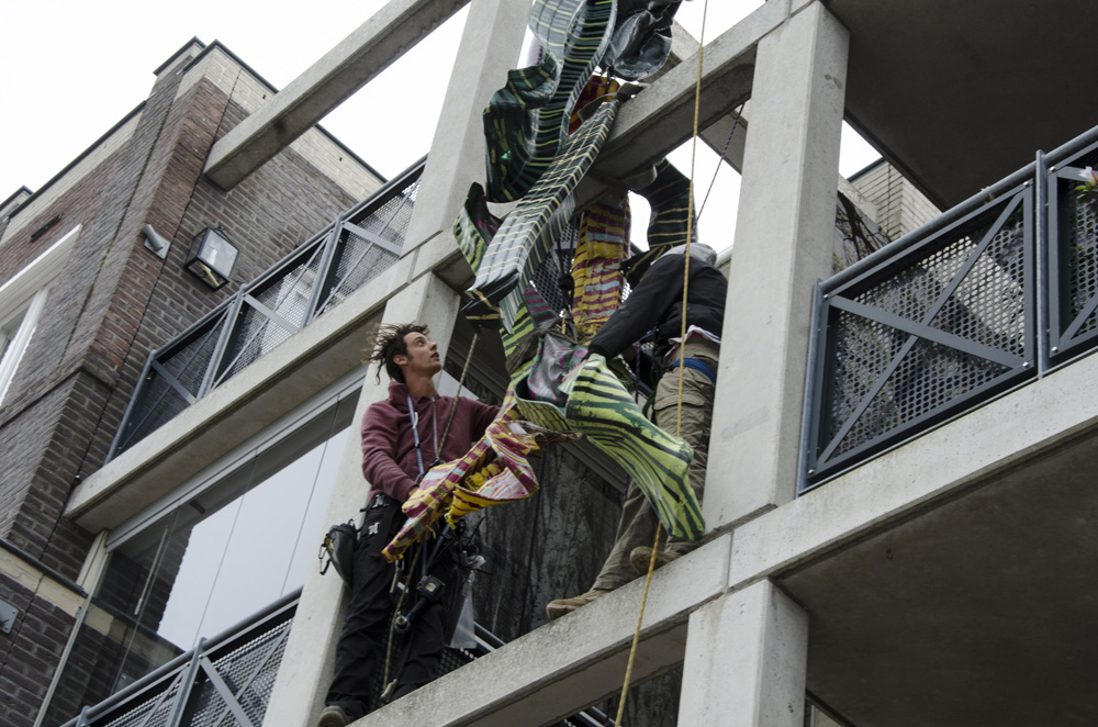 Installation of melted slides sculptures on an apartmentbuilding in Amersfoort.